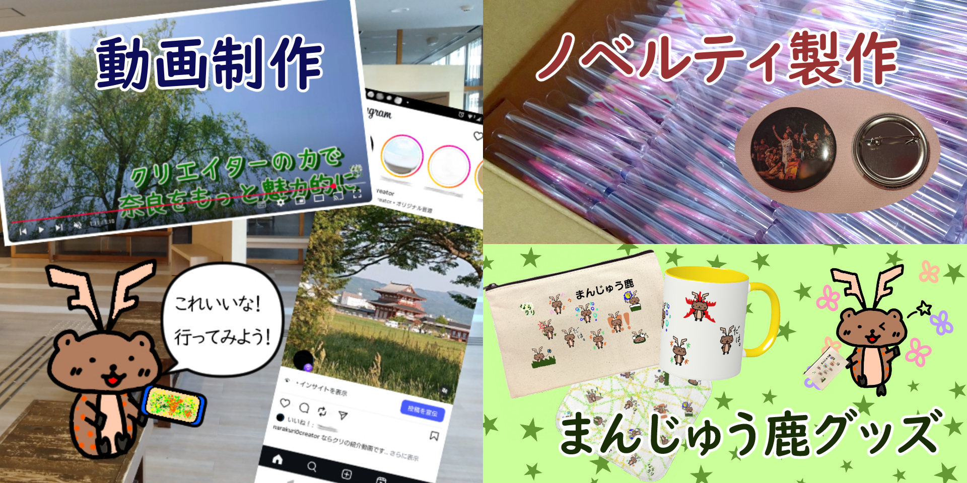 奈良を盛り上げる為、映像制作やノベルティ製作など”ものづくり”で支援していきます。 また、オリジナルキャラ「まんじゅう鹿」のグッズ販売もしております。